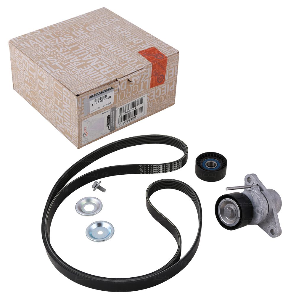کیت تسمه دینام رنو محتوی یک عدد تسمه اصلی رنو 1822 رنو فرانسه، یک عدد سفت کن تسمه با پایه و هرزگرد ثابت تسمه و پیچ و مهره فابریک هزرگرد ها میباشد. این محصول در جعبه رنو با لیبل اصالت و قیمت ویژه در یدککار عرضه میشود.